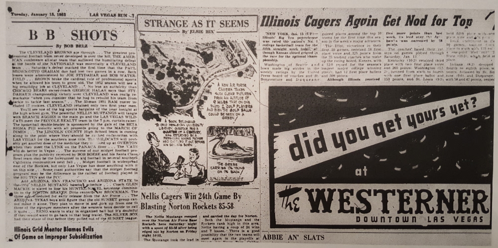 This advertisement from the Las Vegas Sun in January 1952 is the only example of advertising of the Westerner during the ownership of Emilio Giorgetti we were able to find in our research. If you have come across other please send us a copy. This advertising illustrates a very primitive concept of trying to motivate the reader to visit and gamble at Westerner by giving the illusion of coins flying freely through the air just waiting to be easily scooped up. The Gerrgetti advertisement is a stark contrast to some of the more sophisticated ads that Binion created when he owned the Westerner and the Horseshoe. It is obvious that Benny was a bit more well heeled and able to spend more money promoting his business.
